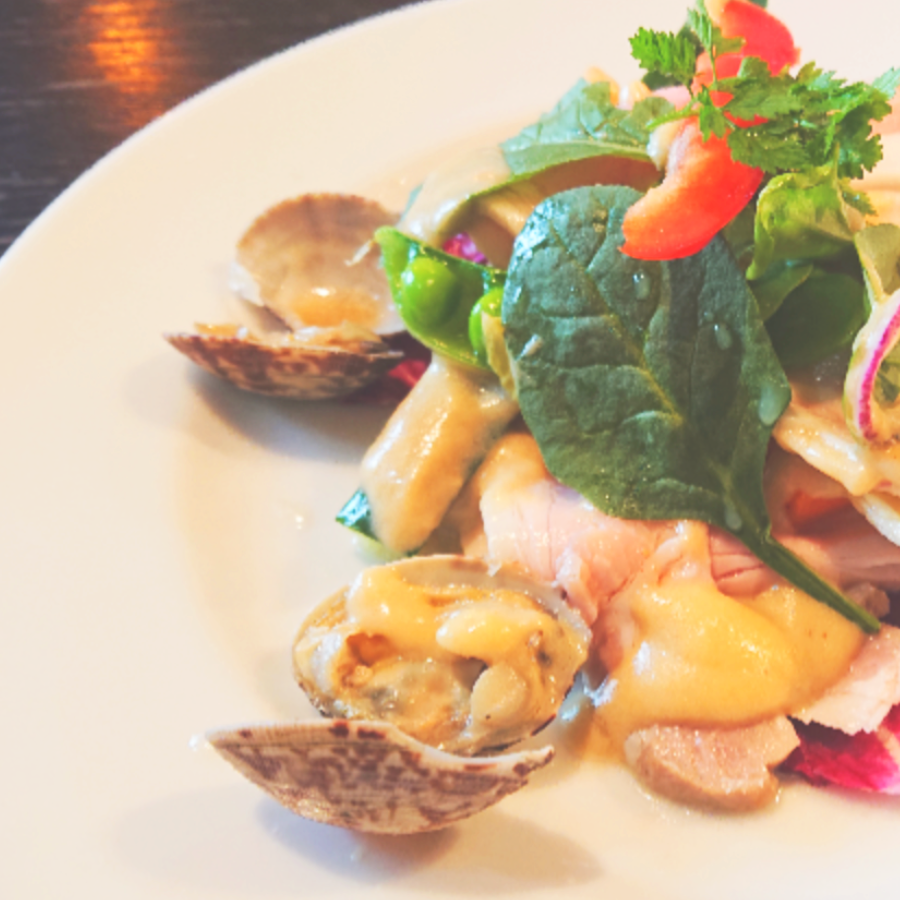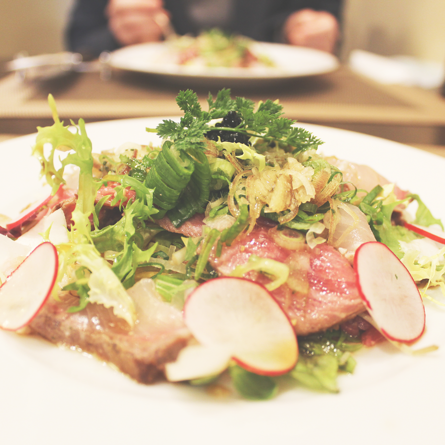鴨フォアグラ、トリュフ、季節野菜のピザサラダ